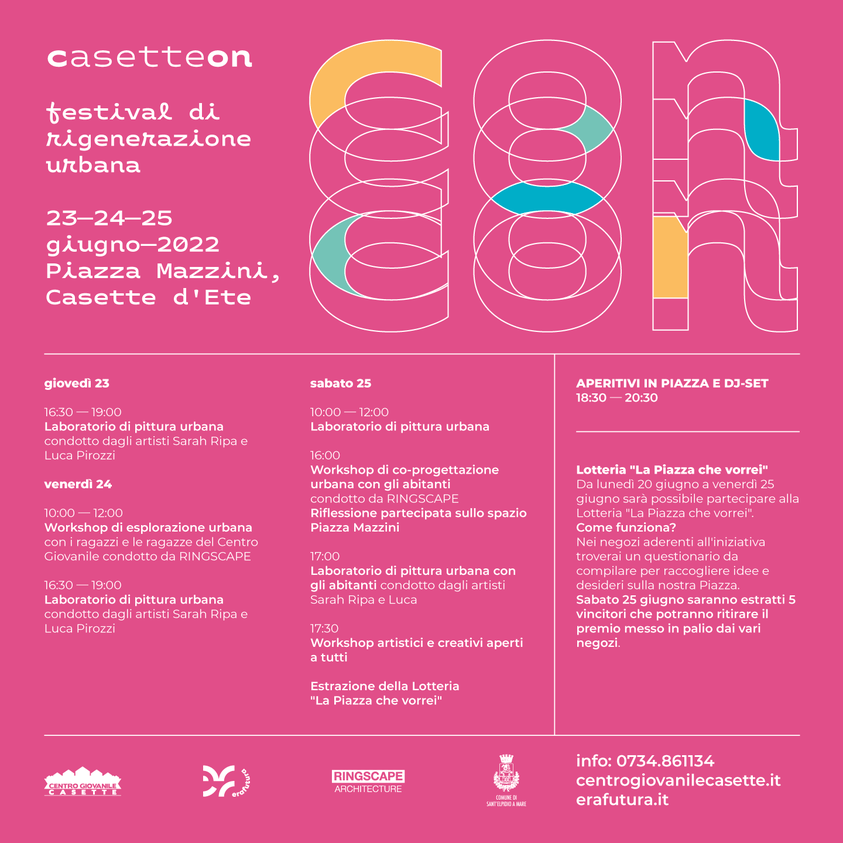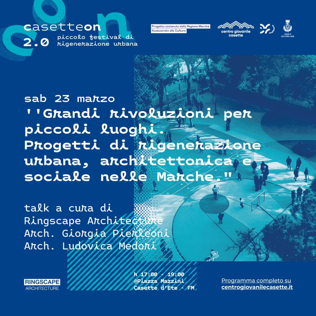 This year we are curating the public TALK “Great revolutions for small places” (Grandi rivoluzioni per piccoli luoghi) during the urban regeneration festival “Casette ON” in Casette d’Ete (Italy).