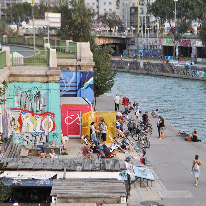 The photoselective net specifically developed for the horticultural market that covers the inner wood structure gives the pavilion a sense of lightness, airiness and flexibility both during the day and during the night. Over the course of the day the yellow colour and the transparency of the net donate unexpecting chromatic reflections that change with the light. At night, the structure becomes a luminous and evocative lantern that accompany the events organized within the Radsommer am Donaukanal festival, such as concerts and film screening.