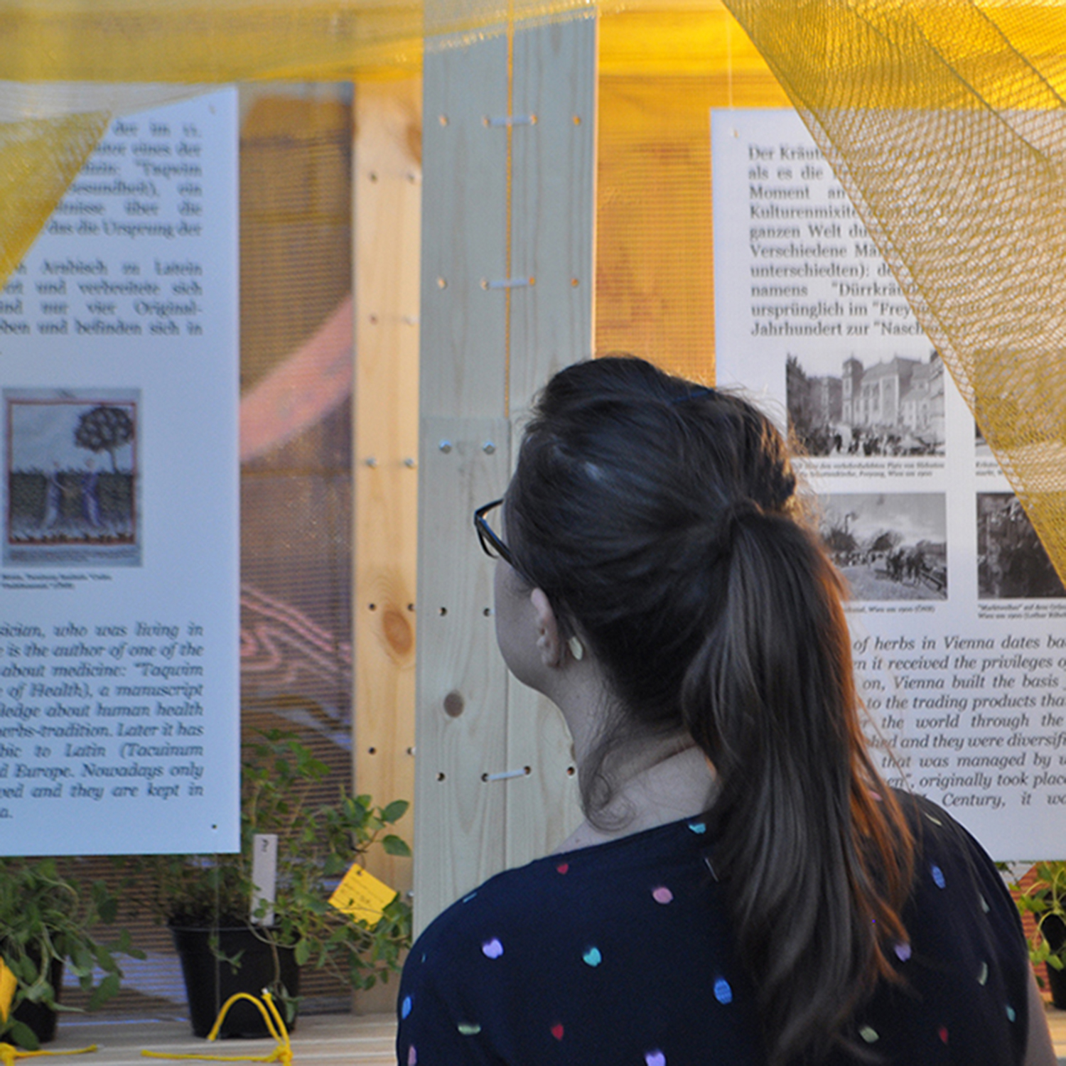The pavilion is an irregular shaped volume built along the banks of the Danube channel, in Vienna. Covered by the yellow net, a sequence of plants stays on wood shelves and turns the pavilion into a sort of green chamber of wonder.