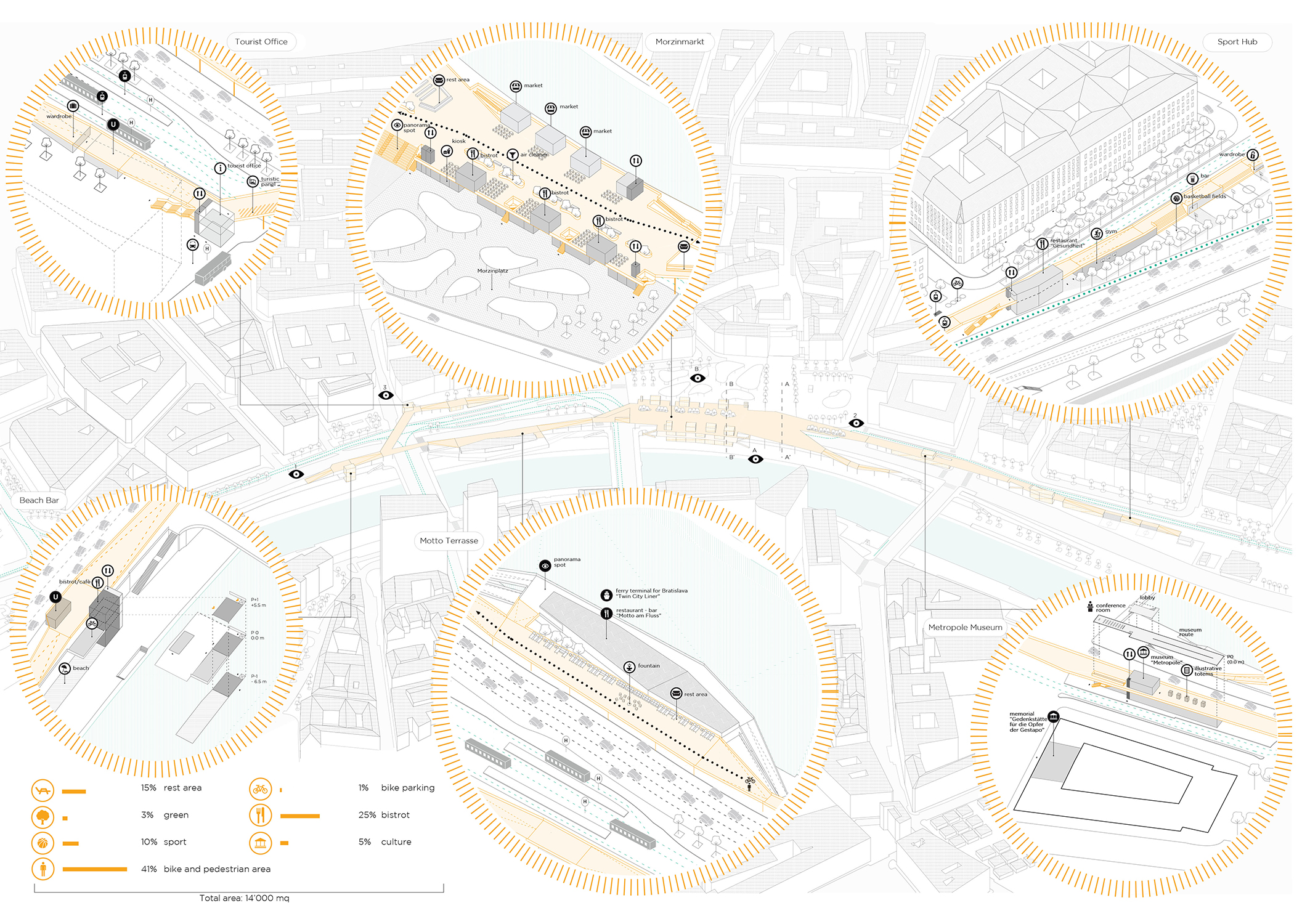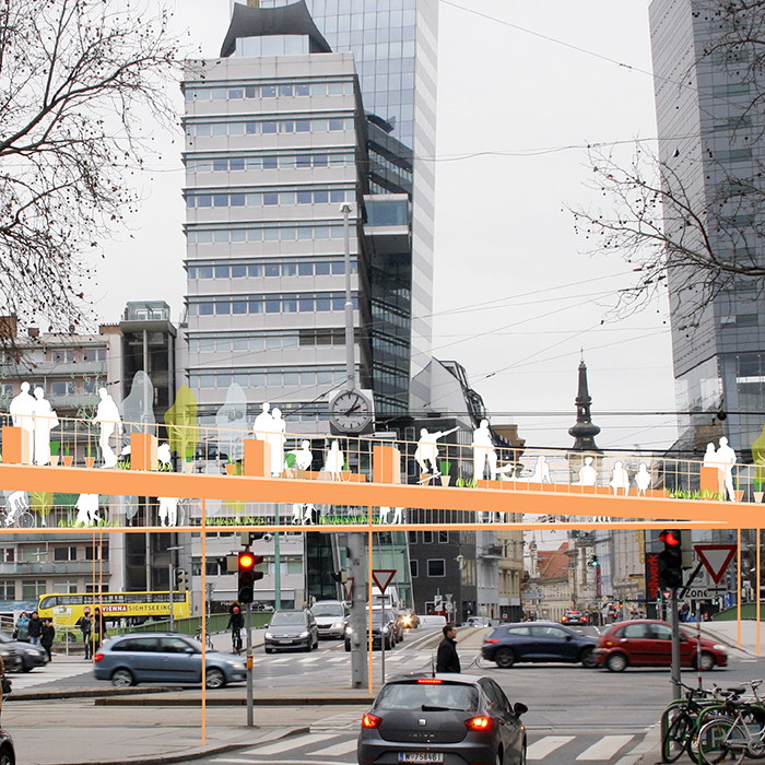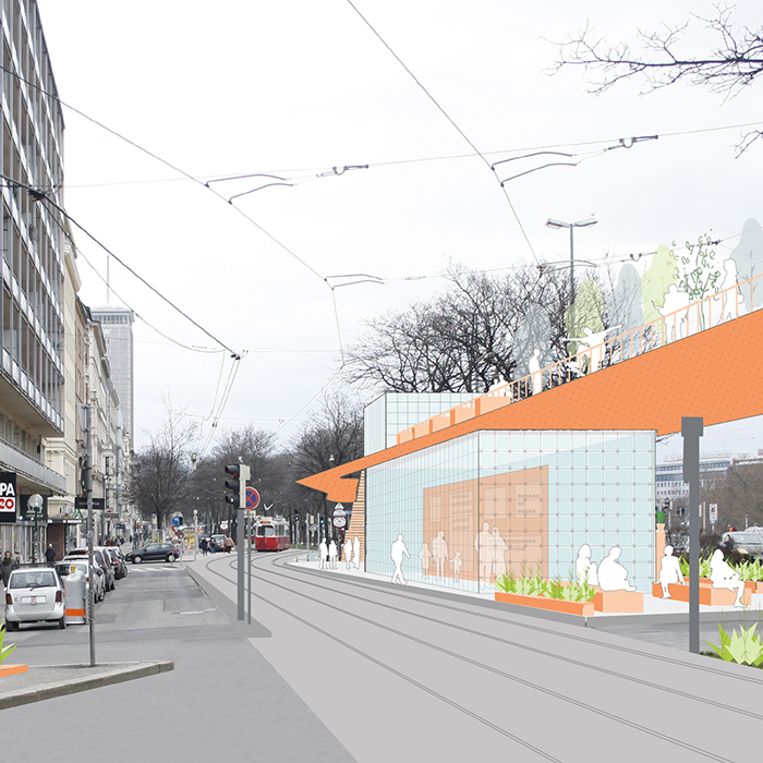 The project picks a specific area in the city of Vienna as case study of the contemporary urban space condition: a central area between the I and II city districts. This area is subject to a pedestrian, vehicular and bicycle traffic that exceeds the 500.000 daily units. It is perceived as a mere crossing space of indifferent traffic flows, which prevents the individuals from any form of social exchange, despite its enormous potential.