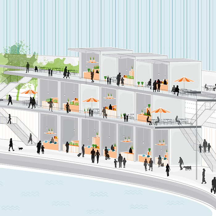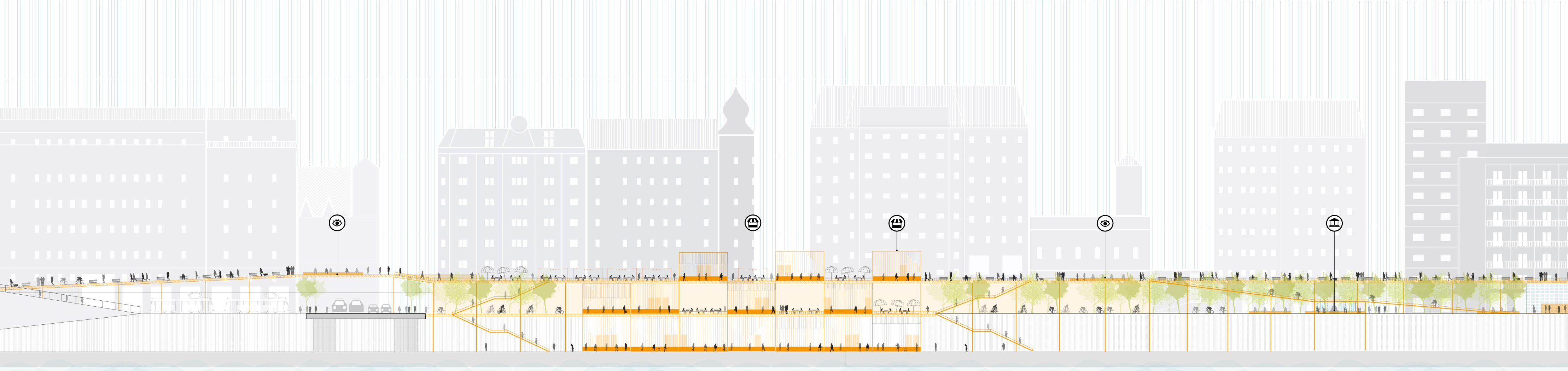The space has been increased by inserting an elevated infrastructure, that allows for the allocation of functions and planned activities and for the creation of connections among portions of the urban fabric. The infrastructure, as a multifunctional public space, acts like a social catalyst which develops new forms of collision and interaction in the complex and shared city space which is designed for different and flexible uses and is responsive to the needs of the community.